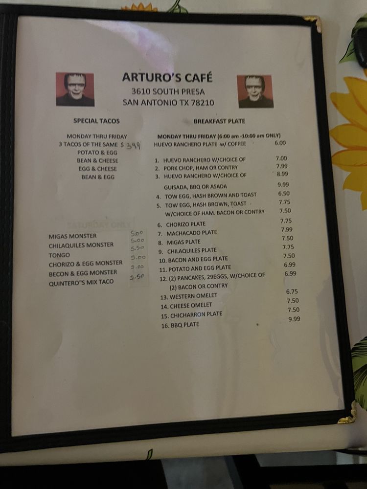 Introducing the menu at Arturo's Cafe, located in San Antonio, TX, is a delightful experience for lovers of breakfast, Tex-Mex, and cafes. With a cozy atmosphere that gives off a homey feeling, this small restaurant offers a diverse menu that has impressed customers time and time again.
